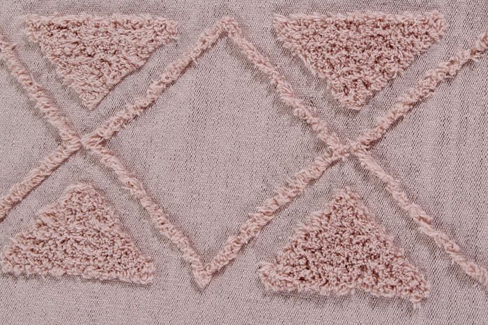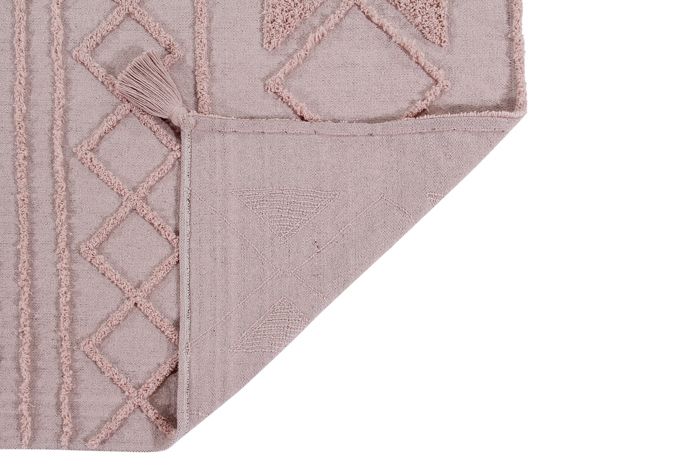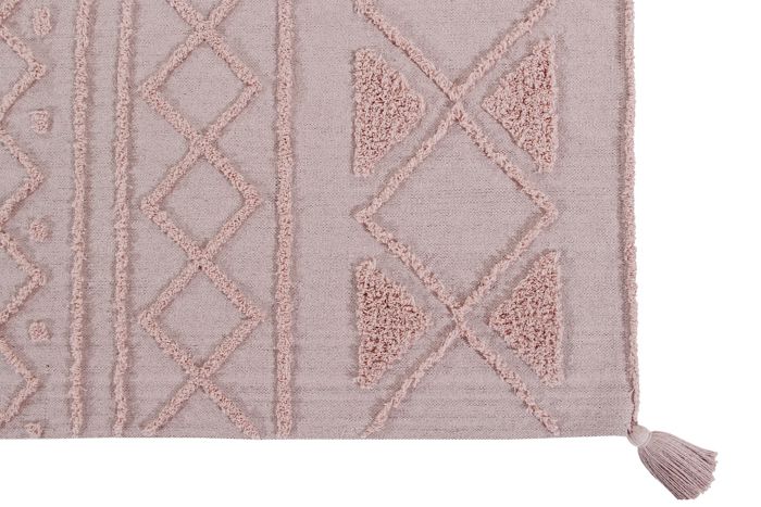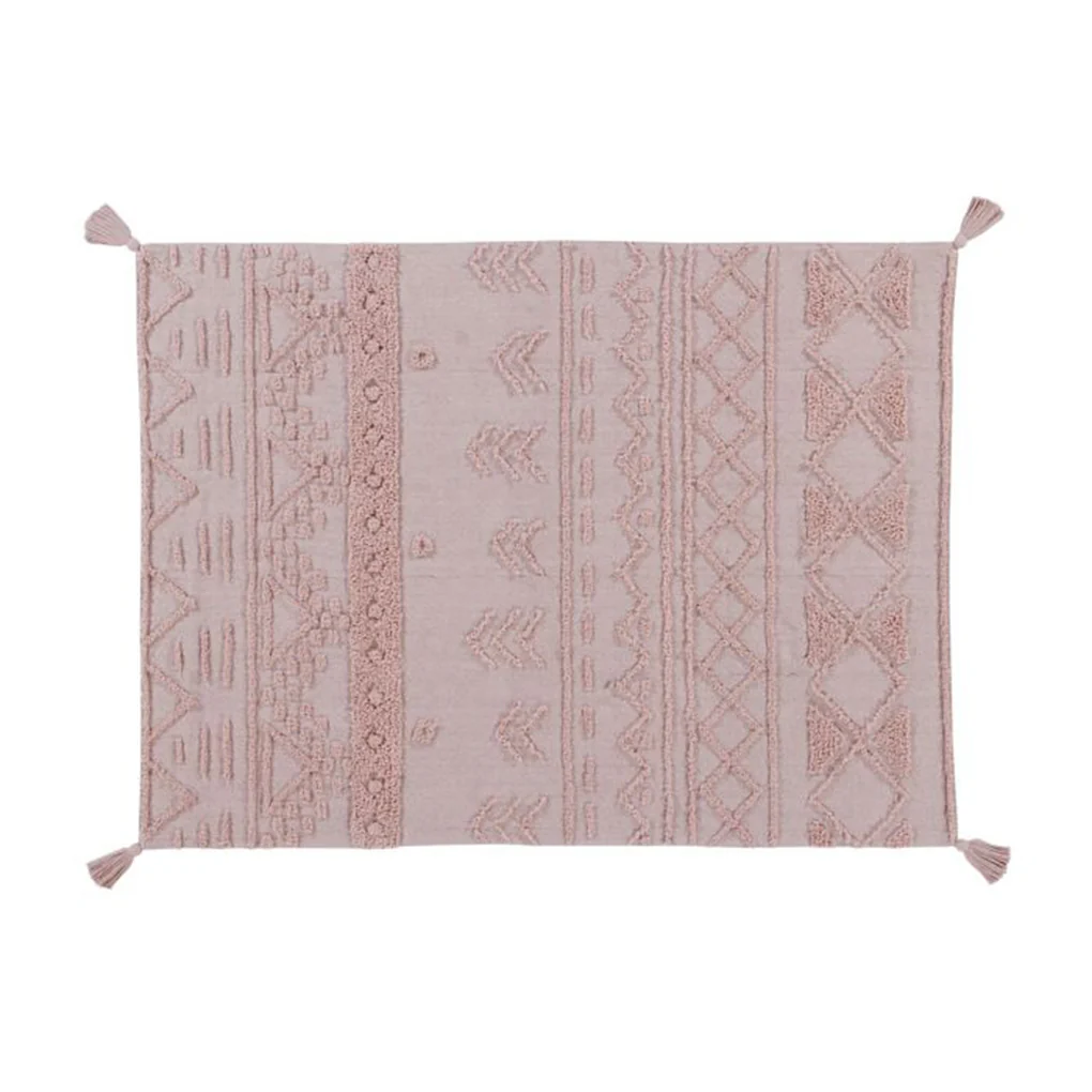 Alfombra de algodón lavable rectangular en color Vintage Nude con un diseño bohemio en el mismo color, con borlas en cada esquina.