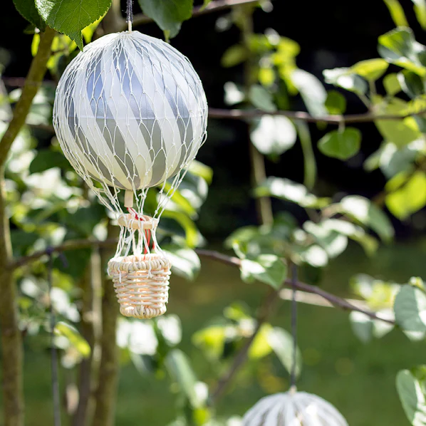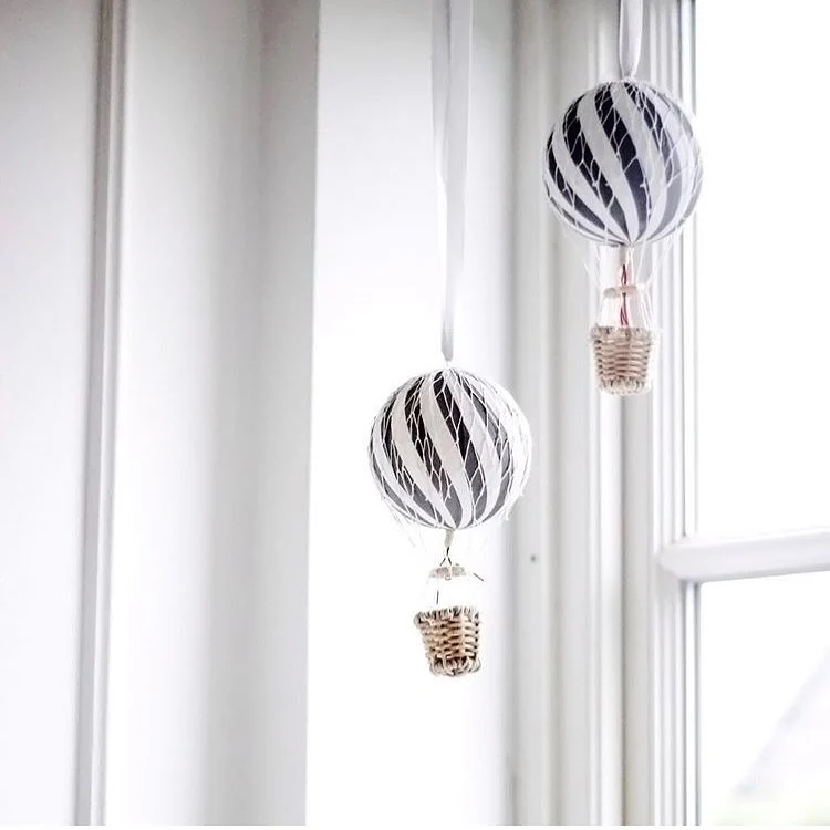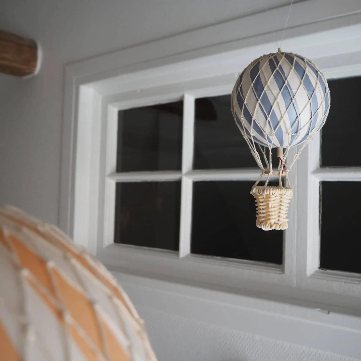 Globo aerostático decorativo inspirador y elegante para la habitación de los niños. El globo aerostático tiene un diseño único y crea un ambiente tranquilo y acogedor para la habitación de los niños. El globo está hecho a mano y con materiales reciclados. Use los globos de aire de forma decorativa colgando globos de aire pequeños y grandes en diferentes niveles del techo.